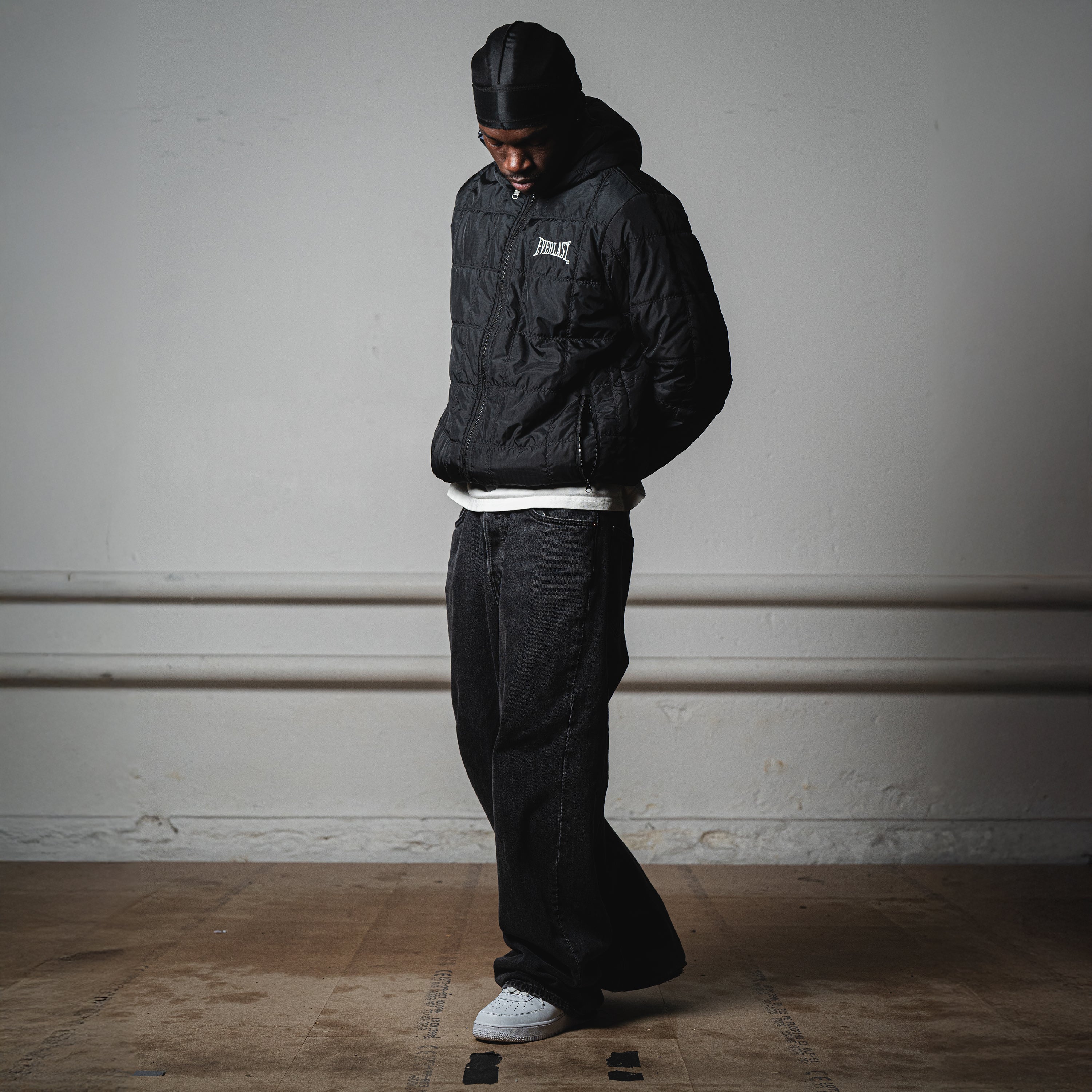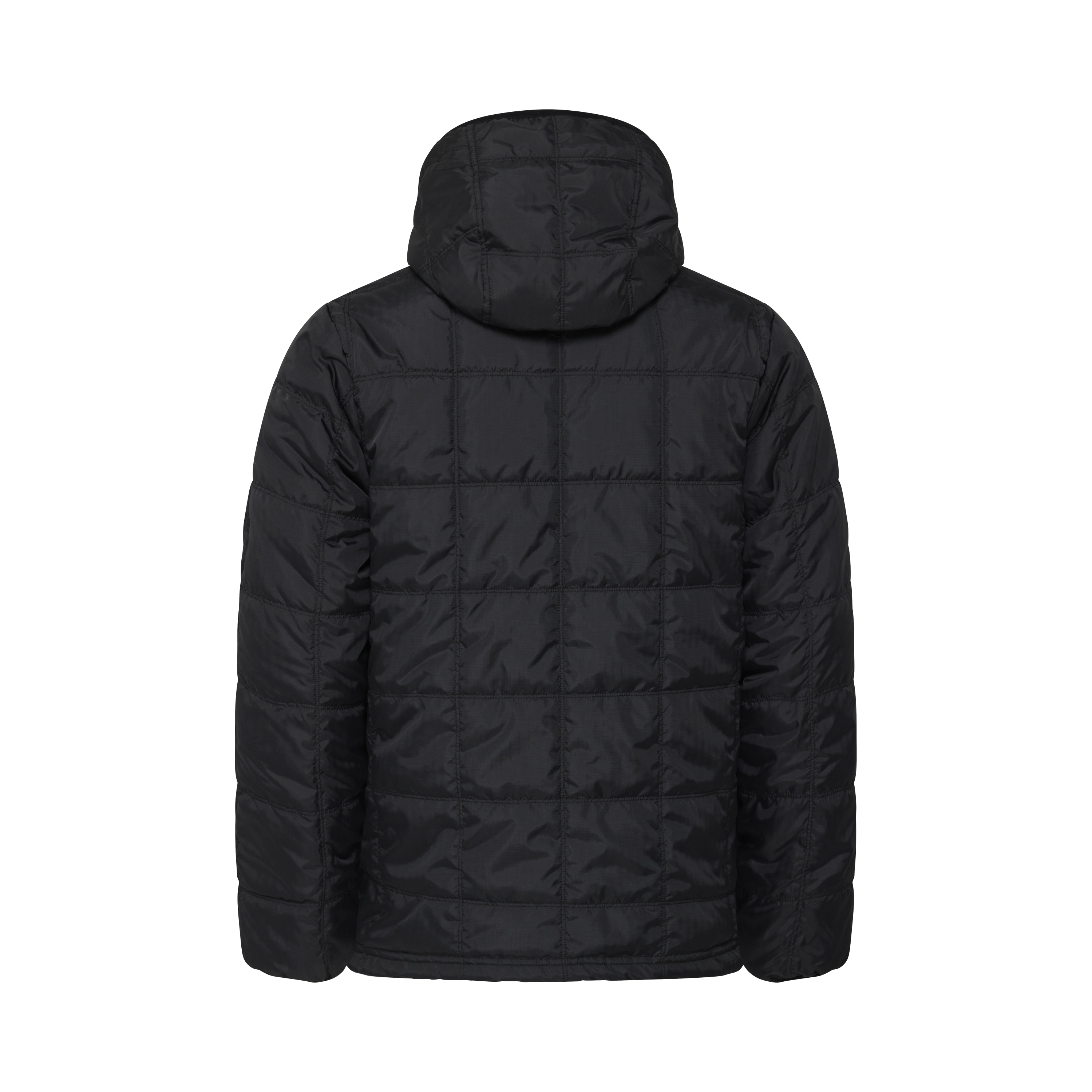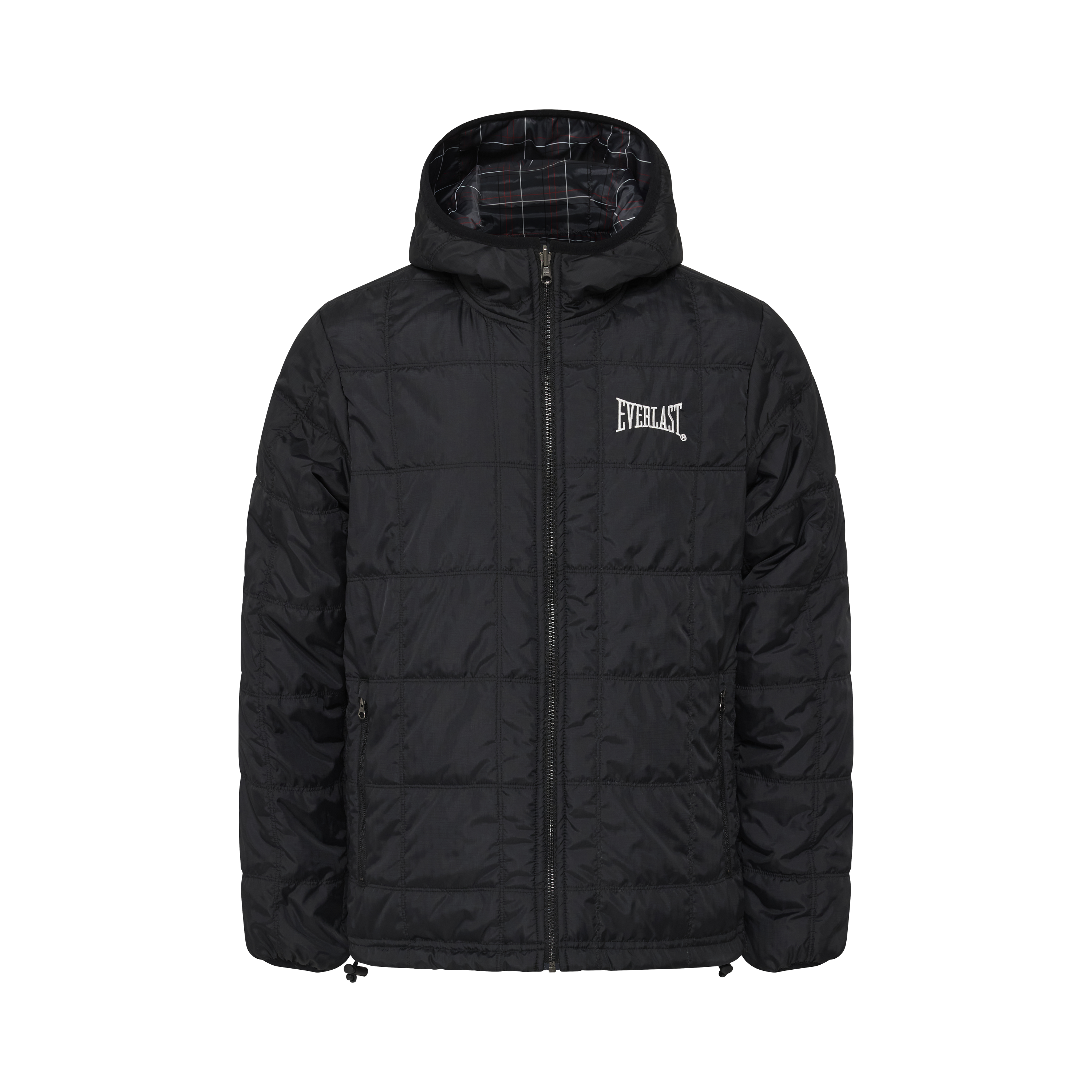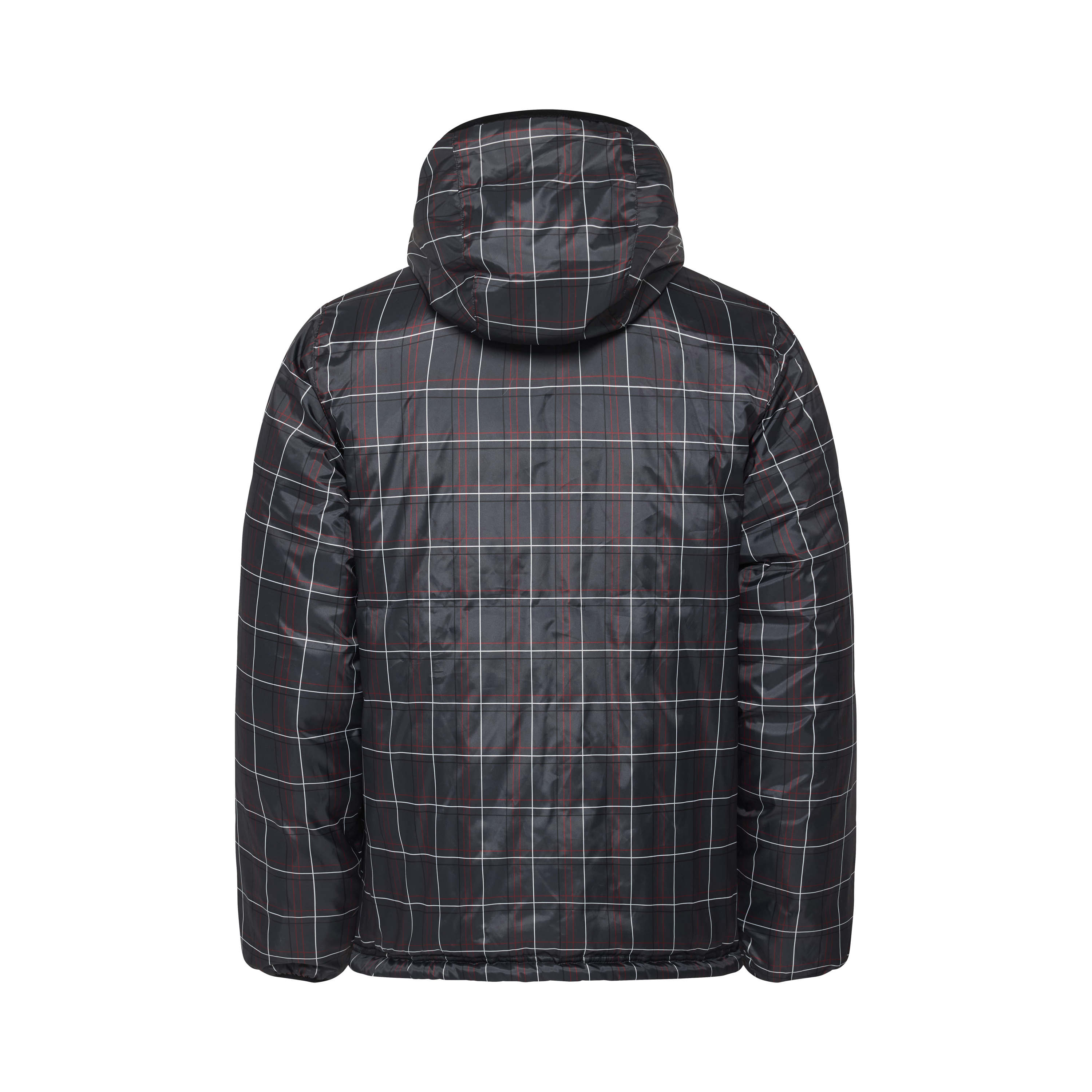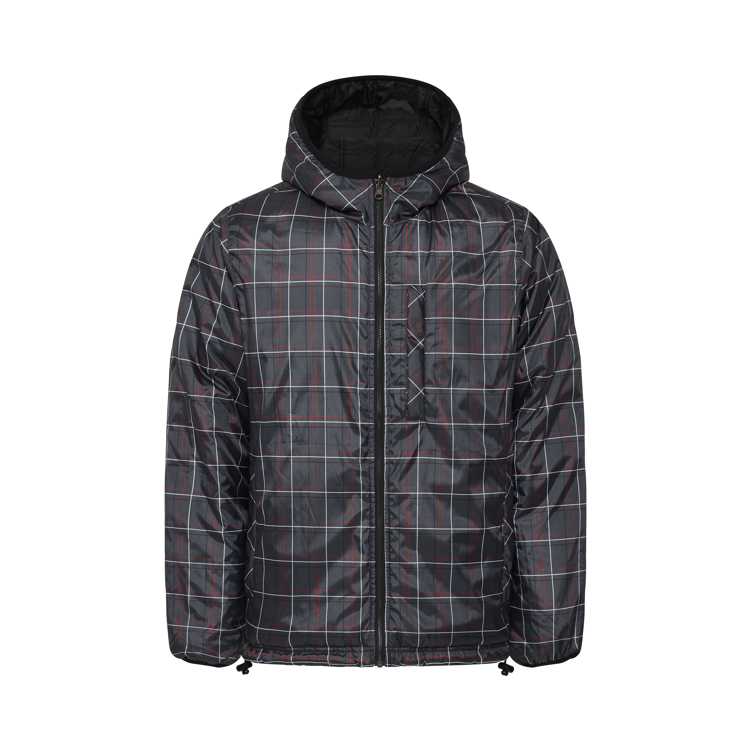 • A 2 in 1 reversible jacket with one side featuring a gray base & checkered pattern & the other side a classic black paneled puff with embroidery logo.