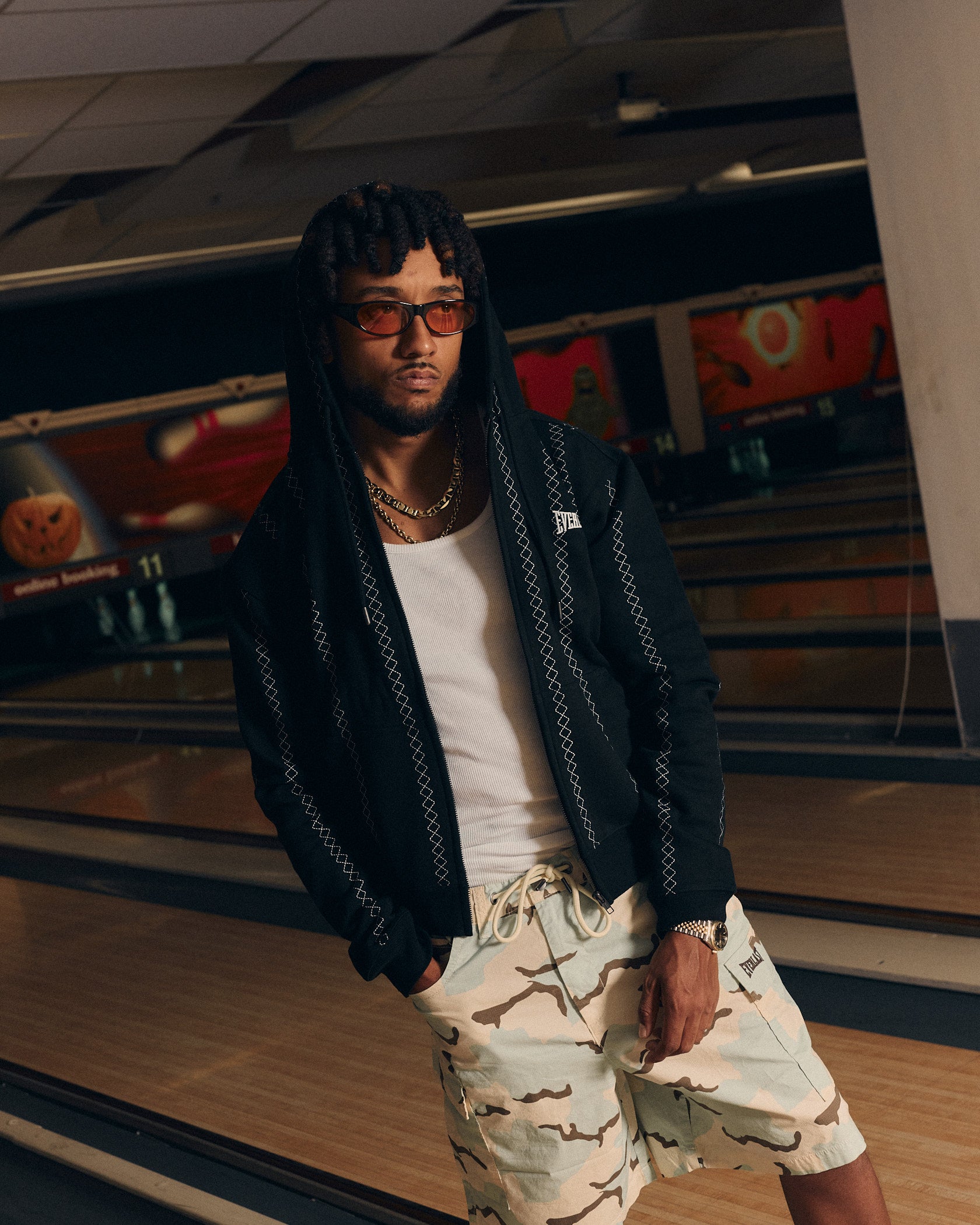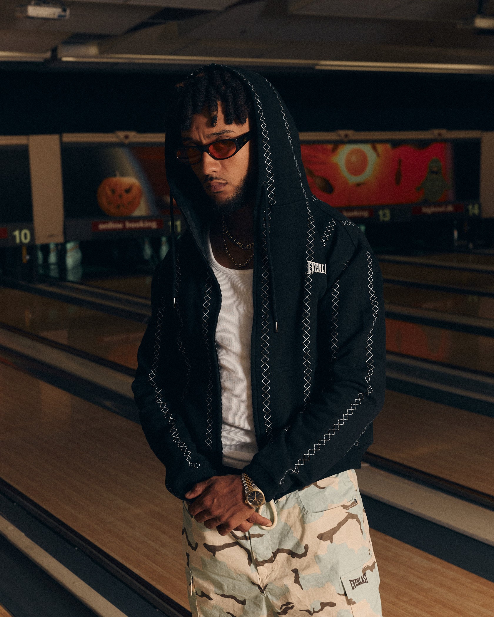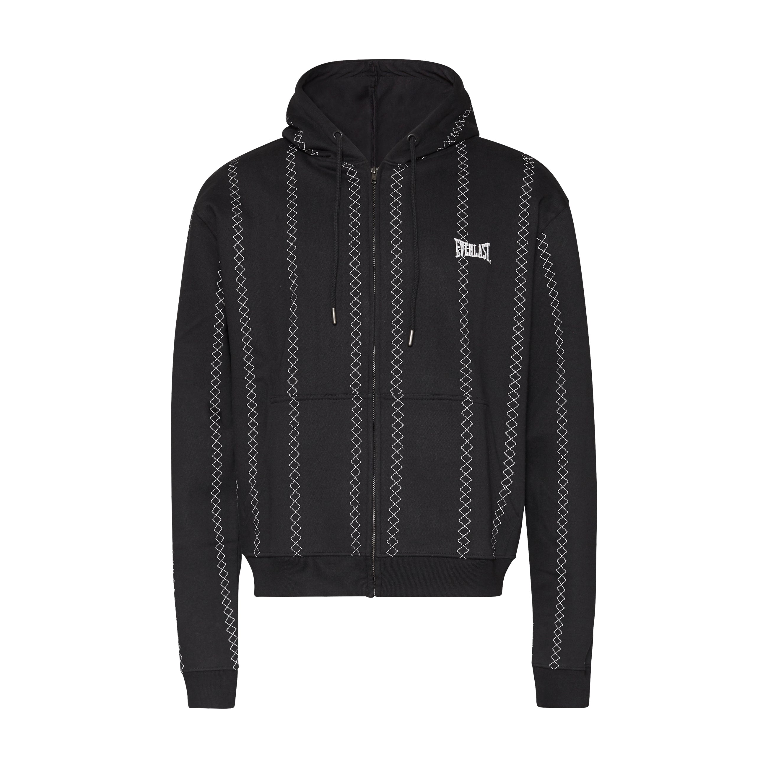 A heavy zip-hoodie a black base with a horisontal stitching pattern.